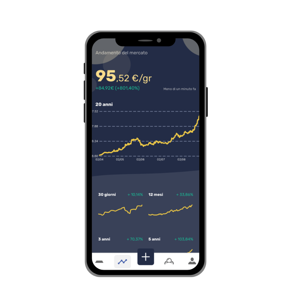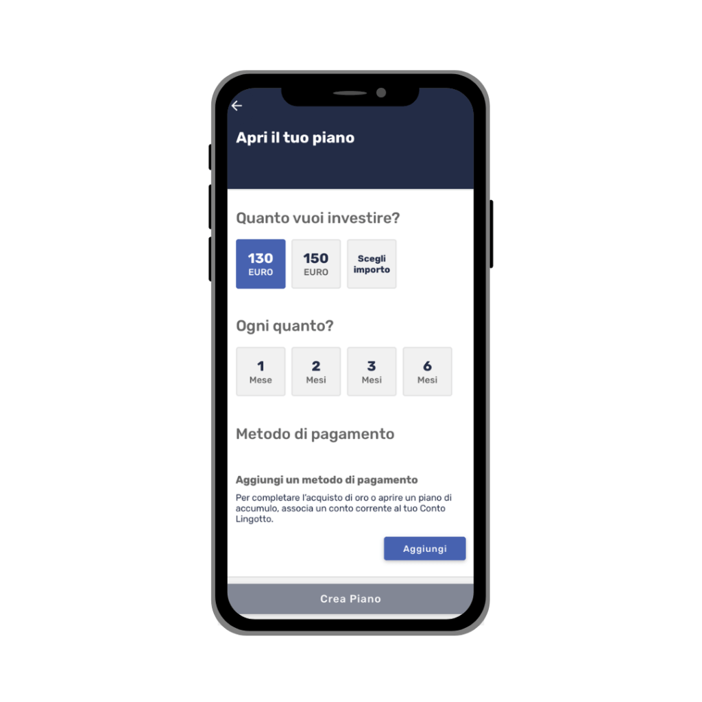 A partire da 130 € al mese, potrai effettuare acquisti automatici di oro fisico, che verranno depositati sul tuo Conto Lingotto, con custodia 100% assicurata. Gli acquisti possono essere fatti con frequenza mensile, bimestrale, trimestrale o semestrale, a seconda delle tue esigenze di risparmio! Per attivare il tuo Piano di Accumulo è sufficiente scegliere l’importo e la frequenza d’acquisto.
